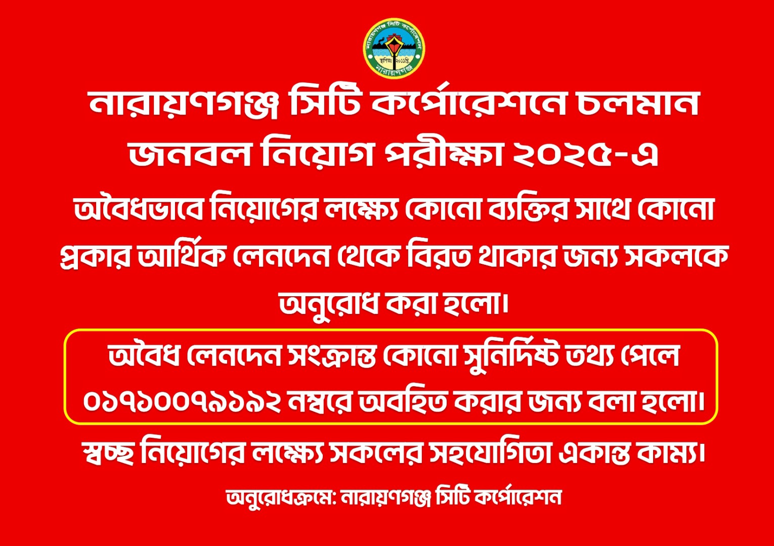 নারায়ণগঞ্জ সিটি কর্পোরেশনে চলমান জনবল নিয়োগ পরীক্ষা ২০২৫-এ অবৈধভাবে নিয়োগের লক্ষ্যে কোনো ব্যক্তির সাথে কোনো প্রকার আর্থিক লেনদেন থেকে বিরত থাকার জন্য সকলকে অনুরোধ করা হলো।