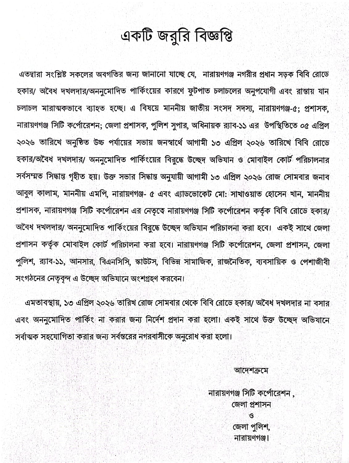 এতদ্বারা সংশ্লিষ্ট সকলের অবগতির জন্য জানানো যাচ্ছে যে, নারায়ণগঞ্জ নগরীর প্রধান সড়ক বিবি রোডে হকার/ অবৈধ দখলদার/অননুমোদিত পার্কিংয়ের কারণে ফুটপাত চলাচলের অনুপযোগী এবং রাস্তায় যান চলাচল মারাত্মকভাবে ব্যাহত হচ্ছে। এ বিষয়ে মাননীয় জাতীয় সংসদ সদস্য, নারায়ণগঞ্জ-৫; প্রশাসক, নারায়ণগঞ্জ সিটি কর্পোরেশন; জেলা প্রশাসক, পুলিশ সুপার, অধিনায়ক র্যাব-১১ এর উপস্থিতিতে ০৫ এপ্রিল ২০২৬ তারিখে অনুষ্ঠিত উচ্চ পর্যায়ের সভায় জনস্বার্থে আগামী ১৩ এপ্রিল ২০২৬ তারিখে বিবি রোডে হকার/অবৈধ দখলদার/ অননুমোদিত পার্কিংয়ের বিরুদ্ধে উচ্ছেদ অভিযান ও মোবাইল কোর্ট পরিচালনার সর্বসম্মত সিদ্ধান্ত গৃহীত হয়।