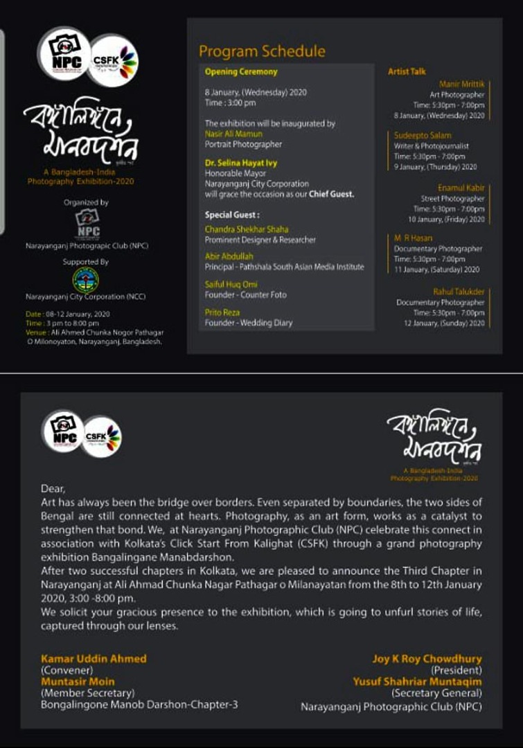 বঙ্গবন্ধুর জন্মশতবর্ষ উপলক্ষে নারায়ণগঞ্জ সিটি কর্পোরেশন কর্তৃক আয়োজিত সংস্কৃতি উৎসব এর ৮ম দিনে (০৮ জানুয়ারী,২০২০) বিকাল ৩-০০ ঘটিকায় আলী আহম্মদ চুনকা নগর মিলনায়তনে নারায়ণগঞ্জ ফটোগ্রাফি ক্লাব (এনপিসি) এর উদ্যোগে বাংলাদেশ ও ভারতের আলোকচিত্র প্রদর্শনী-২০২০ অনুষ্ঠিত হবে। অনুষ্ঠানে প্রধান অতিথি নারায়ণগঞ্জ সিটি কর্পোরেশনের মাননীয় মেয়র ডা. সেলিনা হায়াৎ আইভী।