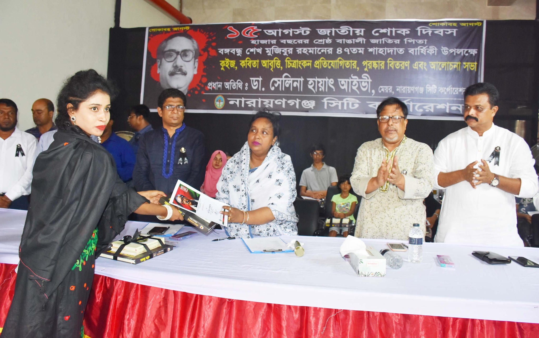 জাতীয় শোক দিবস উপলক্ষে নারায়ণগঞ্জ সিটি কর্পোরেশন প্রাঙ্গণে কুইজ, কবিতা আবৃত্তি, চিত্রাংকন প্রতিযোগিতা ও পুরষ্কার বিতরণ এবং আলোচনা সভা অনুষ্ঠিত হয়।