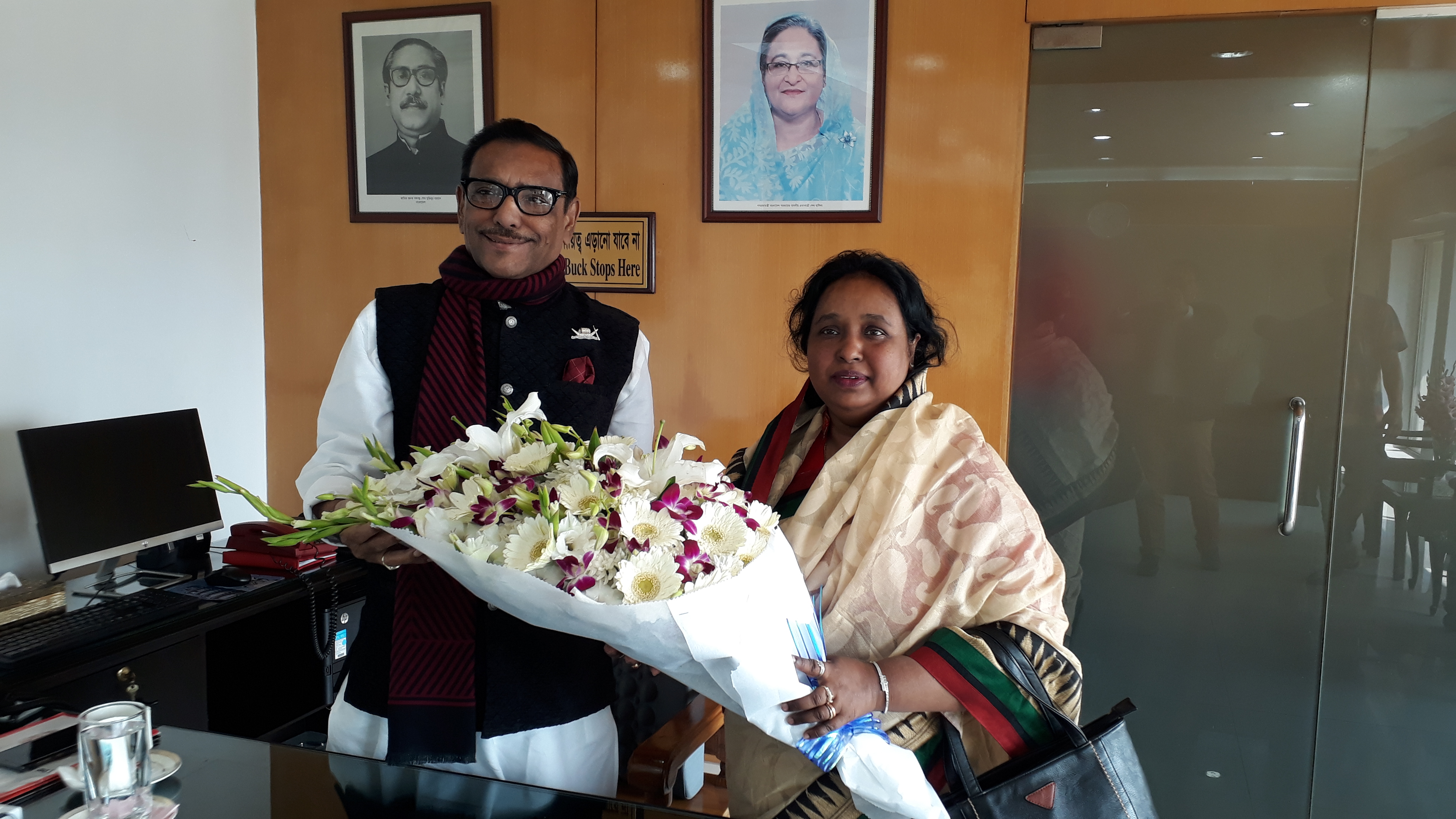 সড়ক পরিবহন ও সেতু মন্ত্রণালয় এর মাননীয় মন্ত্রী এবং বাংলাদেশ আওয়ামী লীগ এর সাধারণ সম্পাদক জনাব ওবায়দুল কাদের কে ফুল দিয়ে শুভেচ্ছা জানাচ্ছেন নারায়ণগঞ্জ সিটি কর্পোরেশনের মাননীয় মেয়র ডা. সেলিনা হায়াৎ আইভী।
