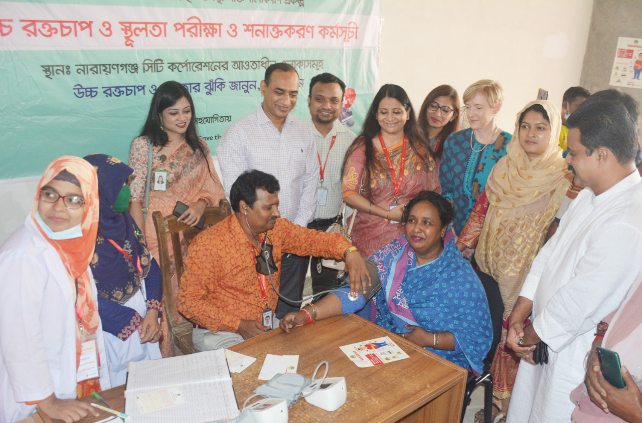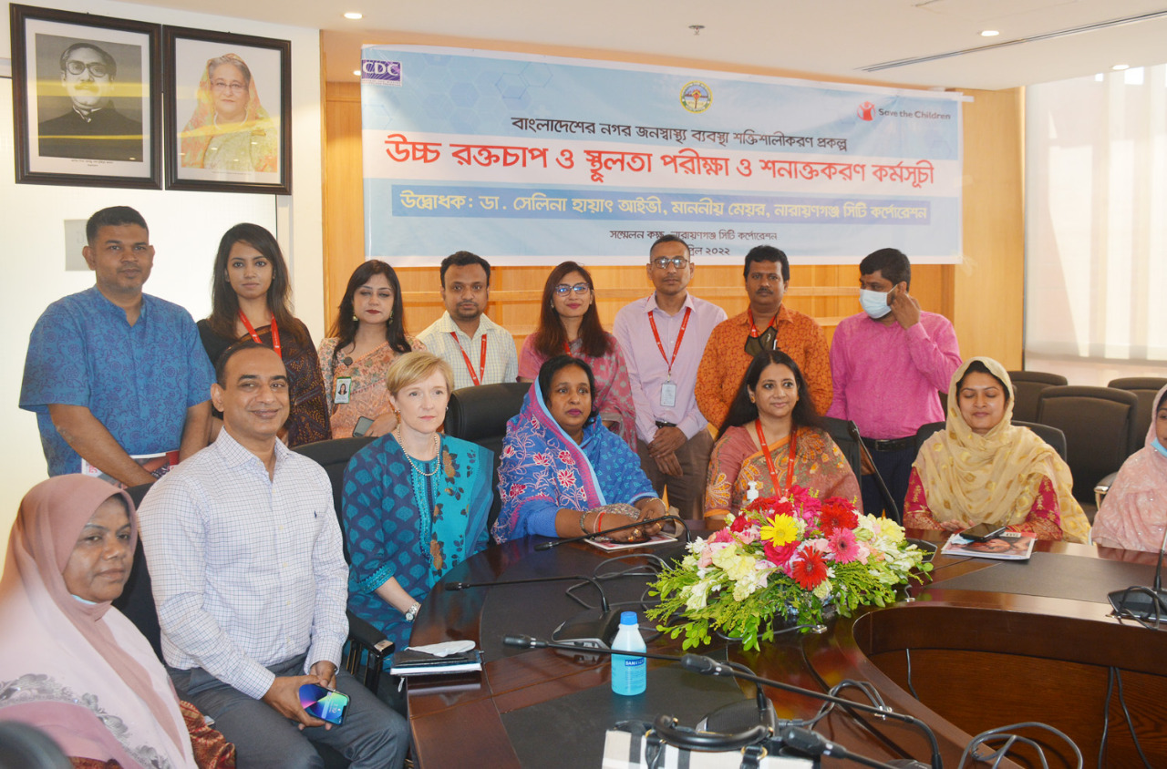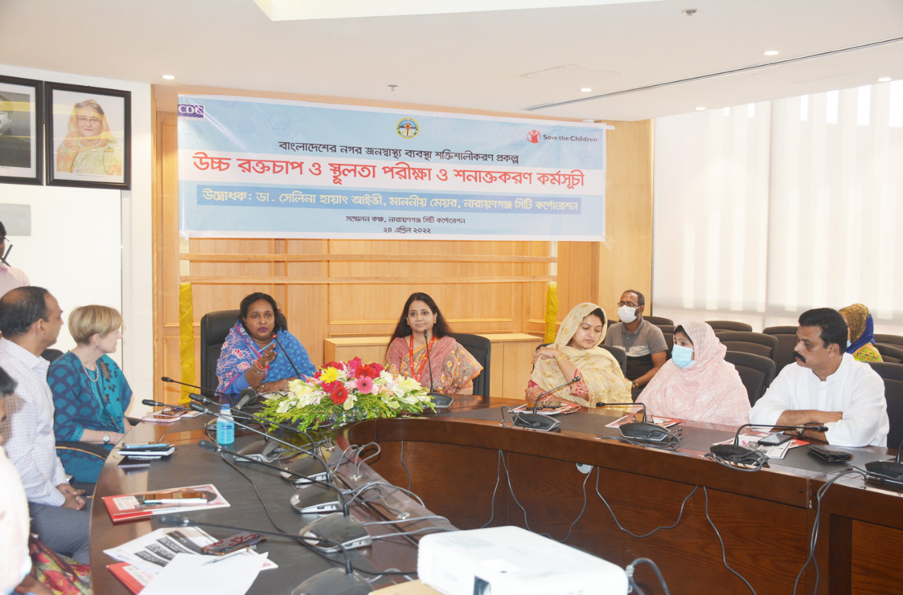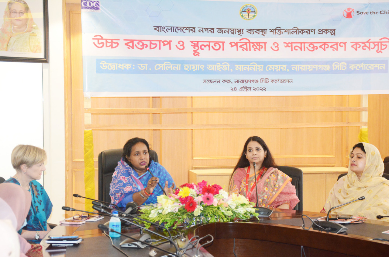 সেভ দ্য চিলড্রেন আয়োজিত বাংলাদেশ নগর জনস্বাস্থ্য ব্যবস্থা শক্তিশালীকরণ প্রকল্পের আওতায় উচ্চ রক্তচাপ ও স্থূলতা পরীক্ষা ও সনাক্তকরণ কর্মসূচী উদ্বোধন করেন নারায়ণগঞ্জ সিটি কর্পোরেশনের মাননীয় মেয়র ডা. সেলিনা হায়াৎ আইভী।